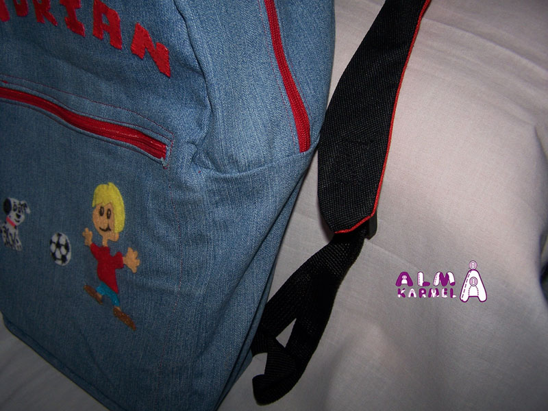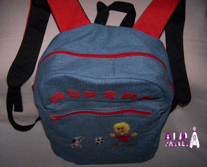 Hoy os enseño esta mochila, para Adrián. En tela vaquera y con los dibujos que el quería.