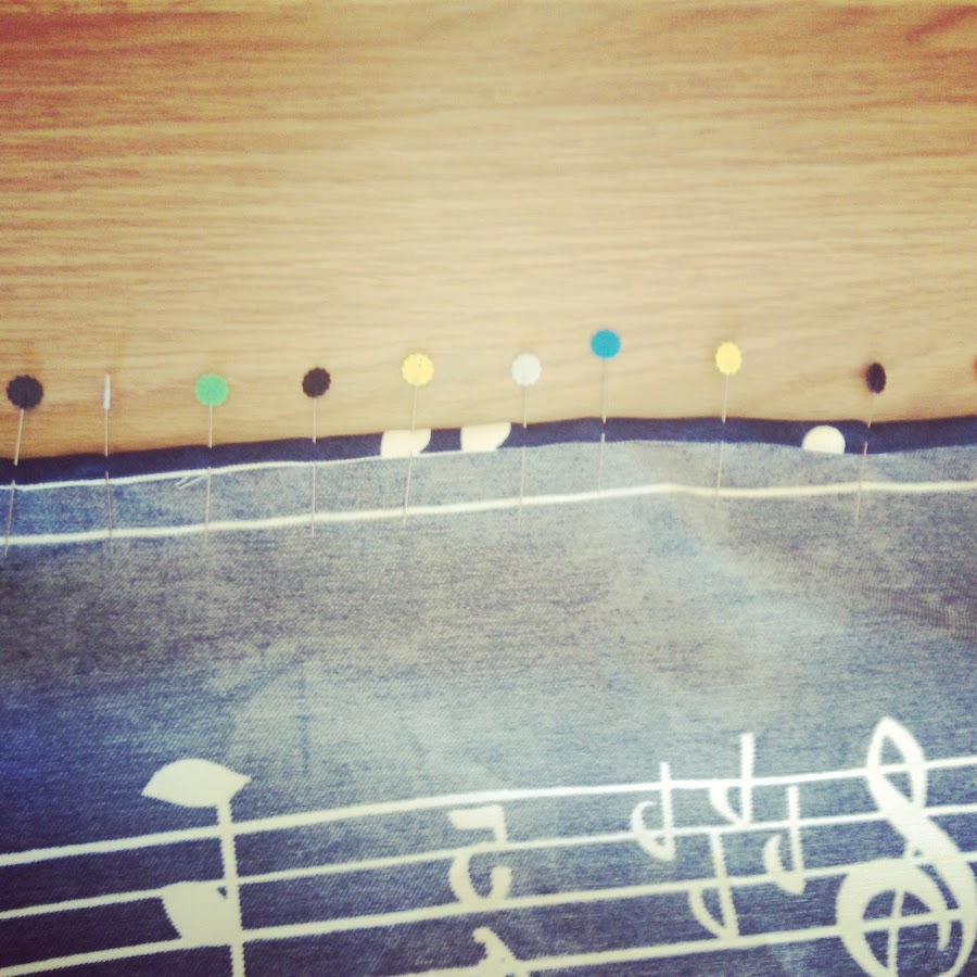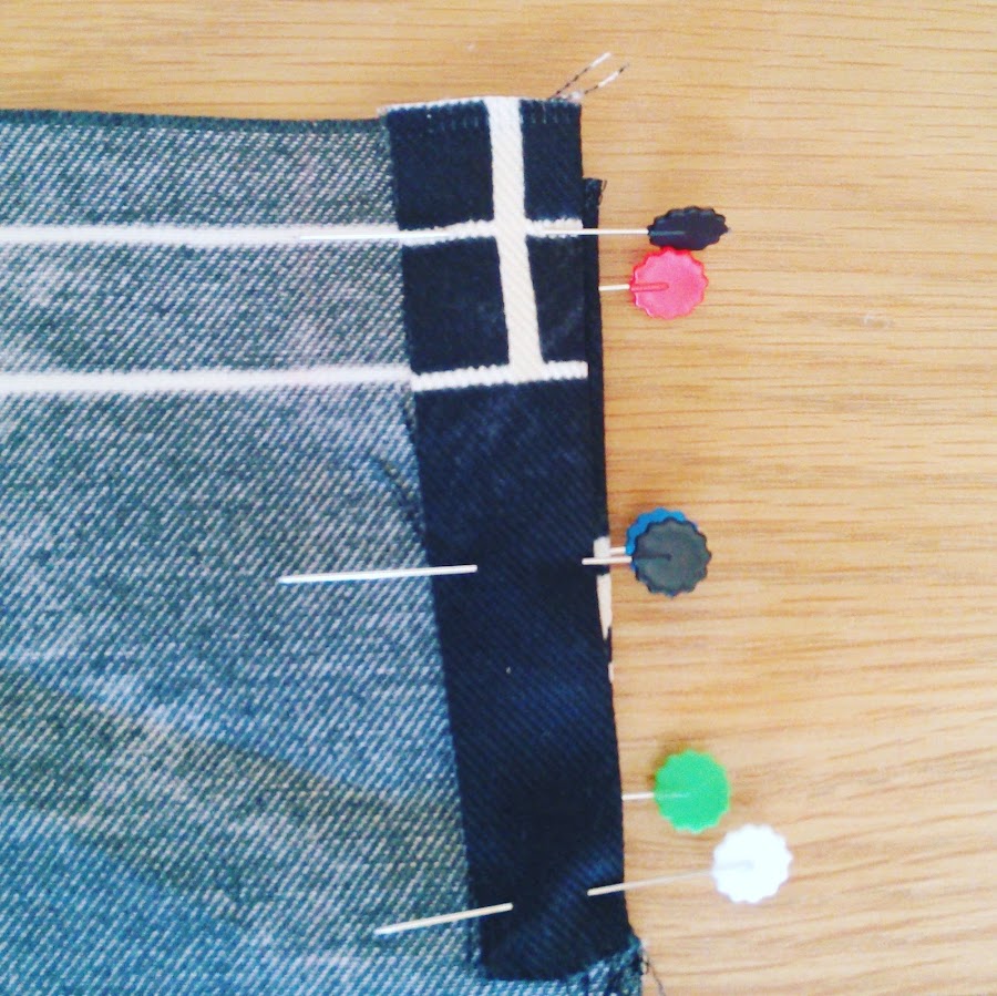 Enfrenta los derechos de los dos rectángulos de tela grandes que cortaste primero y la trabilla tiene que quedar por dentro, sujetalo con alfileres en la parte de abajo de la bolsa y coselo: