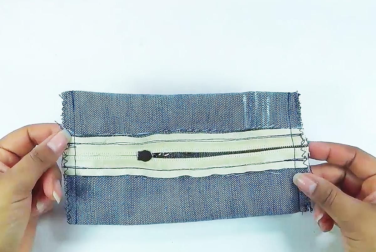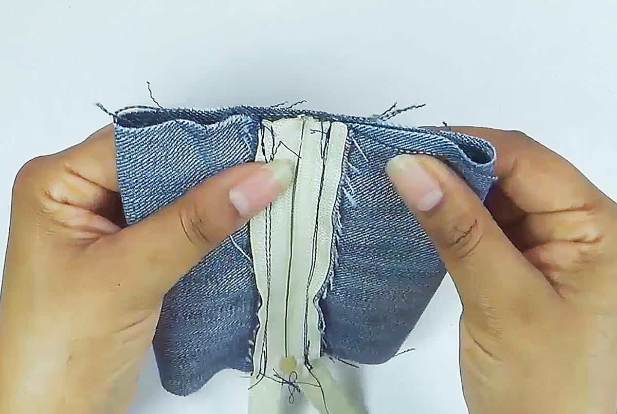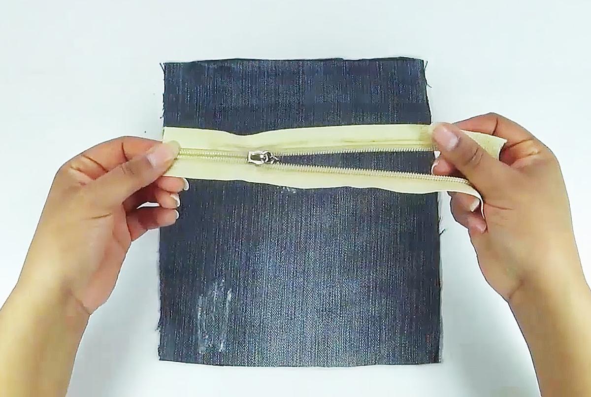 Ahora dobla la pieza de forma que la cremallera quede al extremo y pasa una costura.