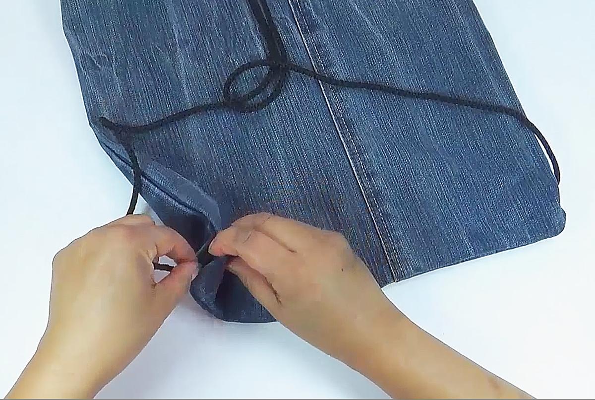 Lleva los extremos hacia los agujeros que dejaste en las costuras y remata con una costura por el revés del morral o mochila.