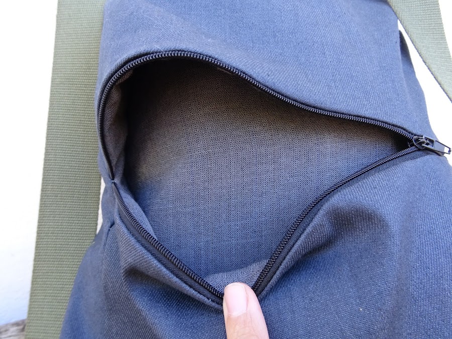 En la parte delantera lleva un solo bolsillo con cremallera, en lugar de hacerla curvada como el patrón, la he subido y la he hecho recta para tener más capacidad en la mochila.
