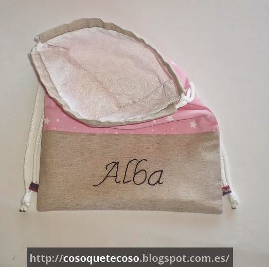 La loneta donde va bordado a mano el nombre, a punto de tallo y con hilo de la Finca nº 12, es muy rústica y da un aspecto de lino.