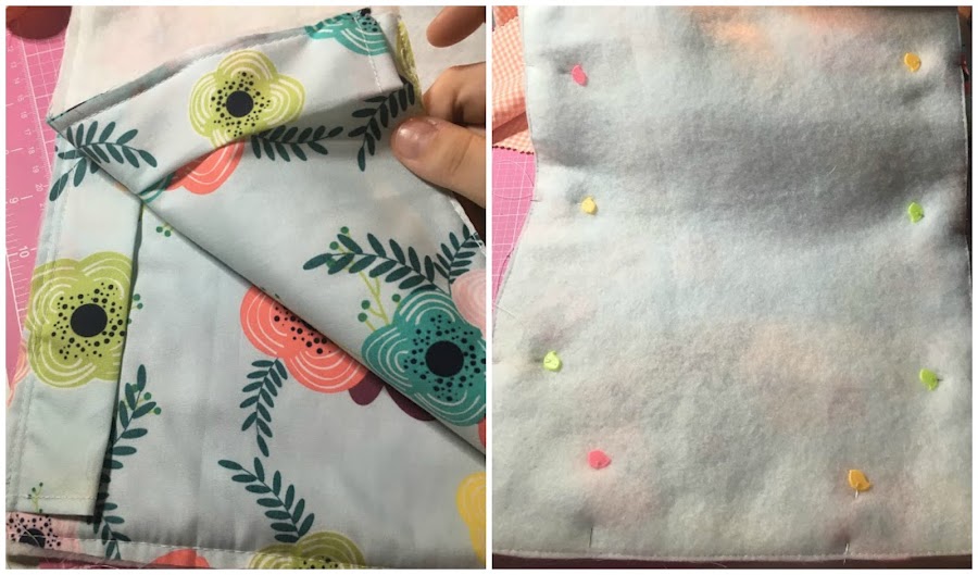 Doblamos ambos extremos de cada pieza hacia dentro y los planchamos para luego coserlos mejor. Por último, una vez cosido, lo doblamos por la mitad, que quede la parte exterior de la tela visible, y sujetamos con alfileres las 2 piezas en las 2 parte superior de nuestra mochila, y lo cosemos.