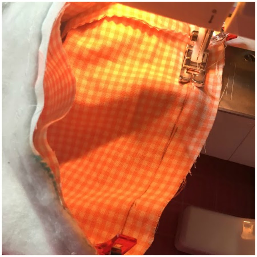 Tenemos que tener en cuenta que las costuras de las dos piezas coincidan perfectamente para que luego se vea mejor acabado. Ahora procedemos a coser en redondo, es decir, con las piezas bien sujetadas con clips de costura y alfileres, cosemos alrededor de todo el contorno superior para que queden unidas las dos partes.