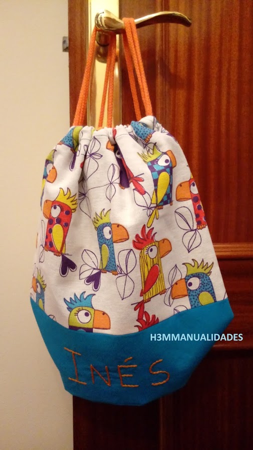 Las dos personas que me encargaron las mochilas eligieron el mismo modelo, tela y combinación de colores, así que eso me facilitó en parte el trabajo, al no tener que andar cambiando de telas. Es una alegre combinación de unos loros simpáticos y muy coloridos, junto a una franja azul, en la que va bordado el nombre (punto cadeneta). Esta pieza es de la misma tela de forro interior. Completa el colorido el cordón naranja de las asas.