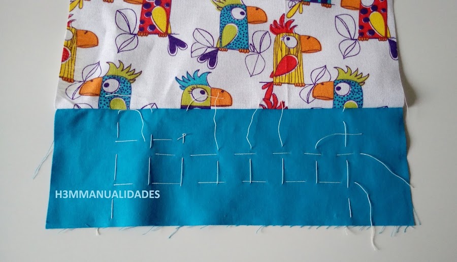 Voy montando el forro y coso las piezas exteriores, cada tela estampada con su franja azul. Aquí se ve: derecho de los loros con derecho de la azul.
