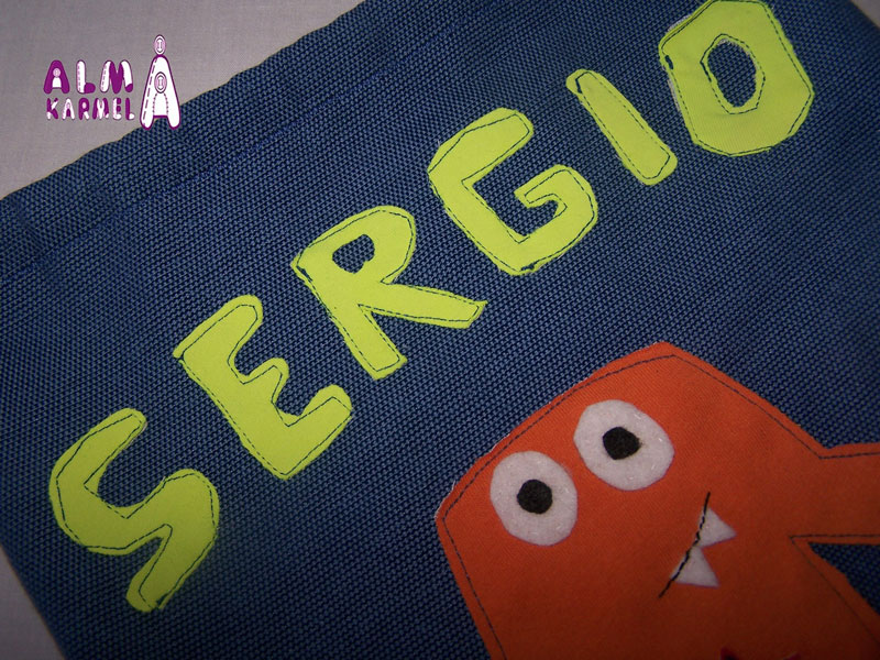 Y esta es para Sergio, un torbellino que no para, con un monstruito divertido y su nombre en tela un poco fosforita.