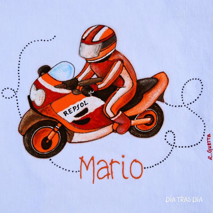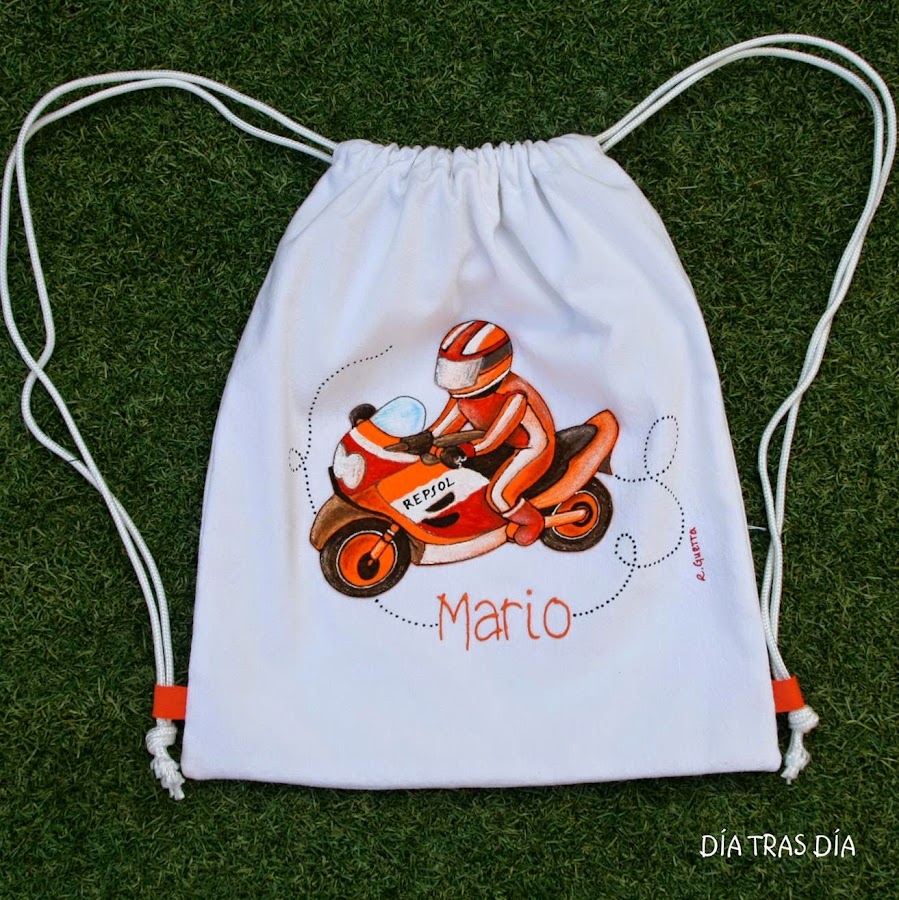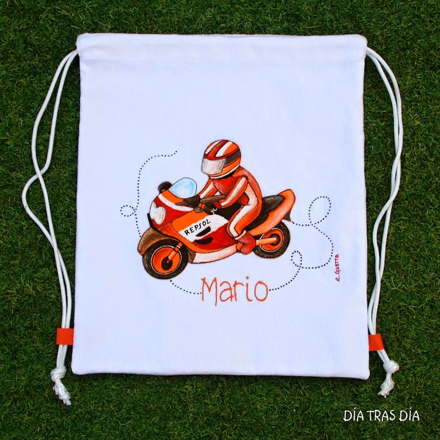 Para Mario, al que le gustan las motos, me pidieron que fuese decorada la mochila con un motorista en su moto, y que si era posible, que llevase los colores de Repsol. Pues aquí está mi versión: