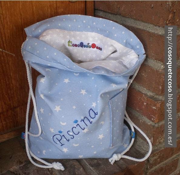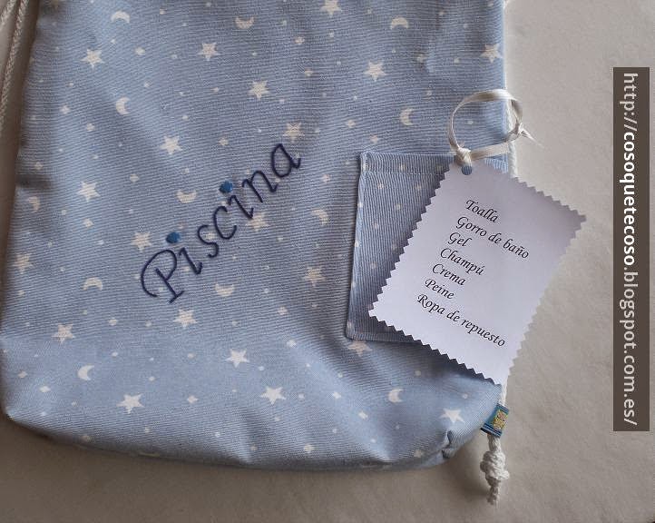 Para la piscina me inspiraba la loneta azul de estrellitas, combinada con otra de lunares para el bolsillo y el pasacintas. El interior también de estrellitas pero en blanco.