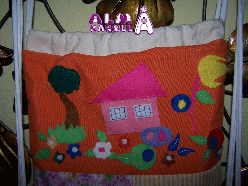 Os traigo dos modelos diferentes, la parte de abajo, con la técnica del patchwork, y en la parte superior, con el fondo liso, de color naranja, un dibujo de una casita y un jardín, un tanto originales, ya que las formas no son muy rectas...... pero de esa manera, le da mucho movimiento ;)
