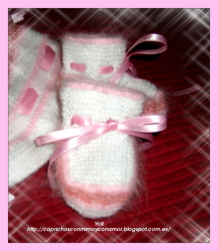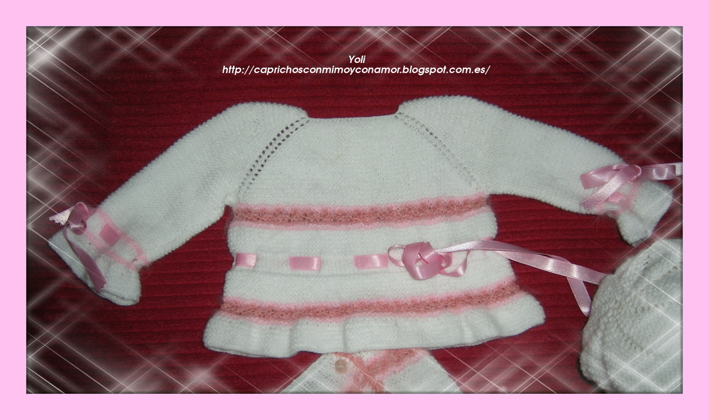 Realizado en suave lana bebe, perlé y delicada angora en tonos rosas.
