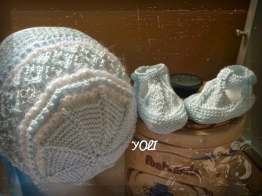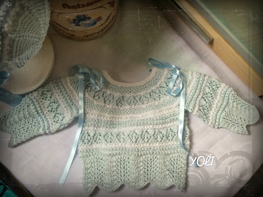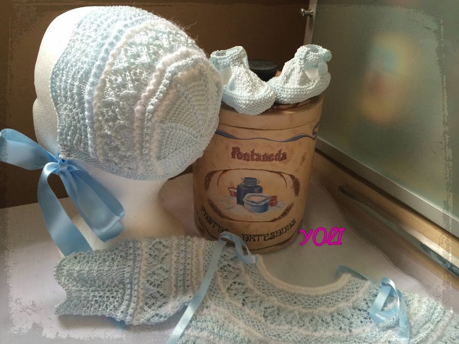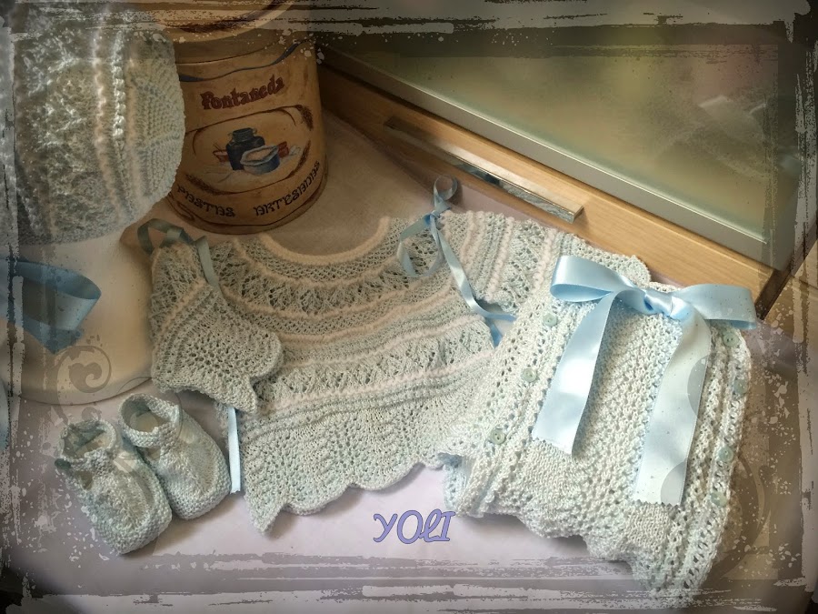 Soy una fan incondicional del blog de tutoriales de Rosa y de ahi copie el cubrepañal, fue lo primero que teji y el resto del conjunto con un poquito de aqui y otro de alla lo conjunte al cubrepañal. si os animais pinchar en la letra roja y os lleva directo al patron!!!