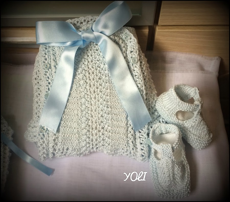 Es un conjunto de bebe en color clasico tejido en perle celeste y un toque de angora blanca, muy poquito para que la mami no se queje de que suelta "pelito" talla 0/3 meses perfecto para los bebes que naceran en verano.