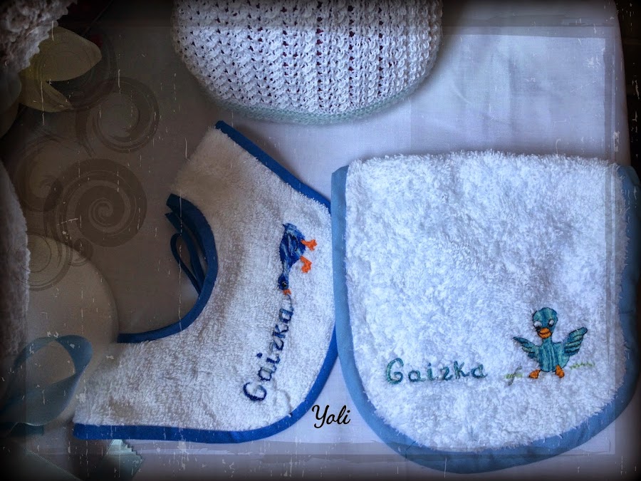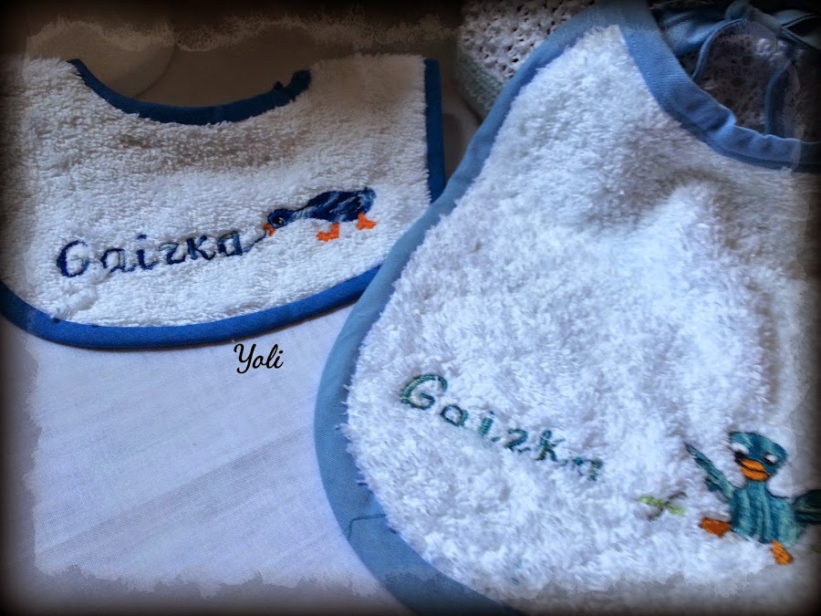 Tambien unos baberos que aprovechando restos de rizo y bieses le hicimos a mano y bordo como no.....mi ama!!