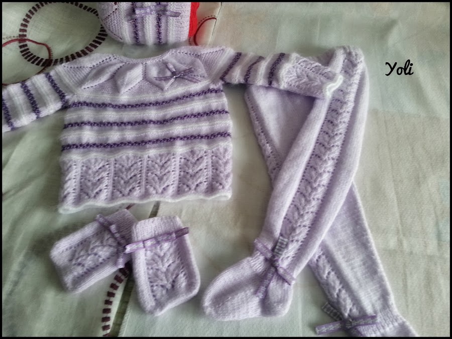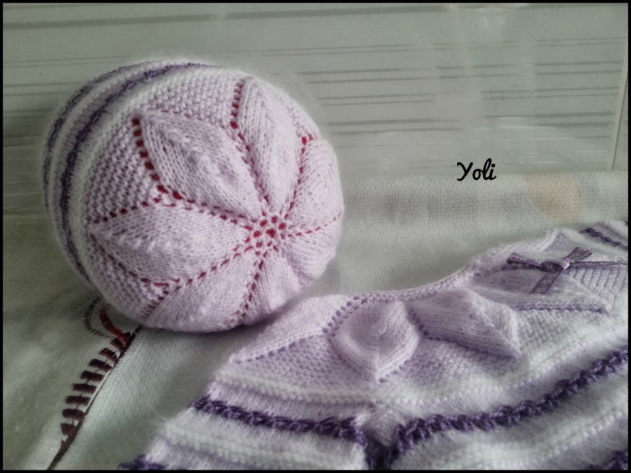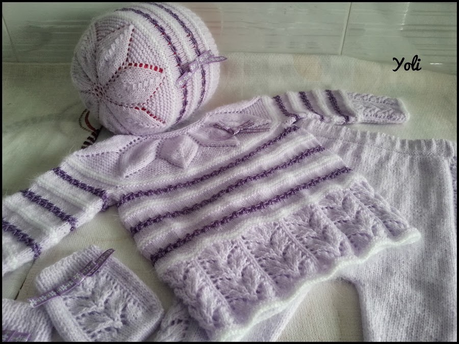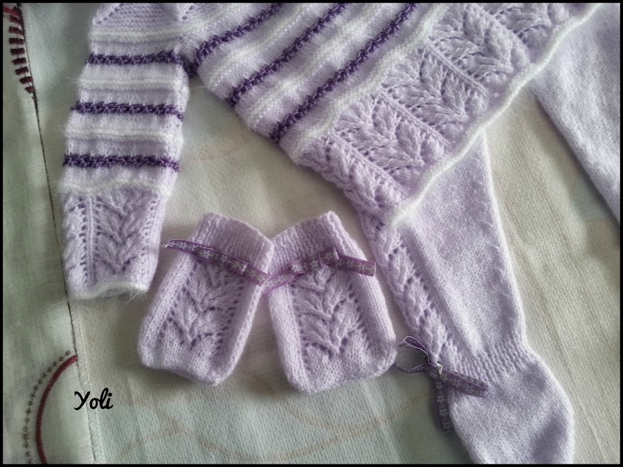 Como nacera en enero va completo y abrigado, jersey, polaina,mitones y esta vez en lugar de capota un original gorrito "casquete". Tejido en lana malva, perle morado y suave angora blanca.