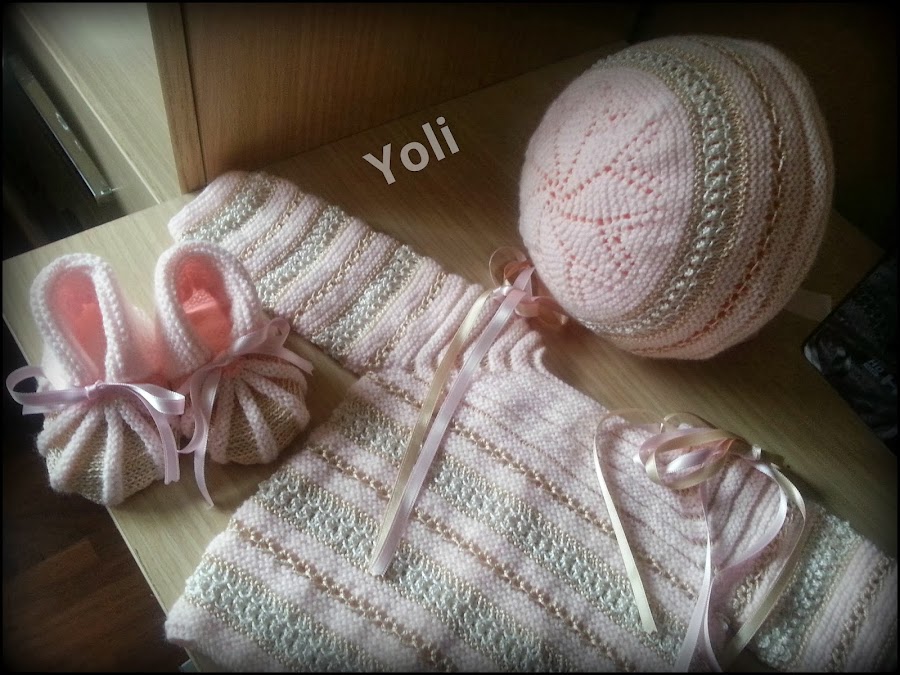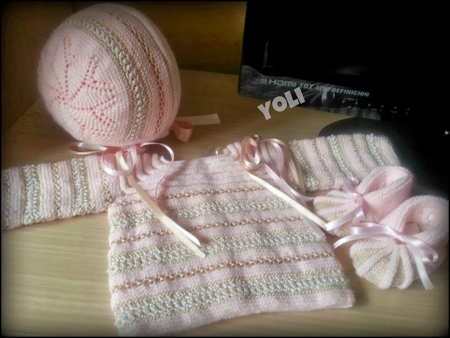 Tejido en suave lana rosa bebe y combinado con toques de perle en dos tonos , camel y blanco roto, que le aportan brillo.
