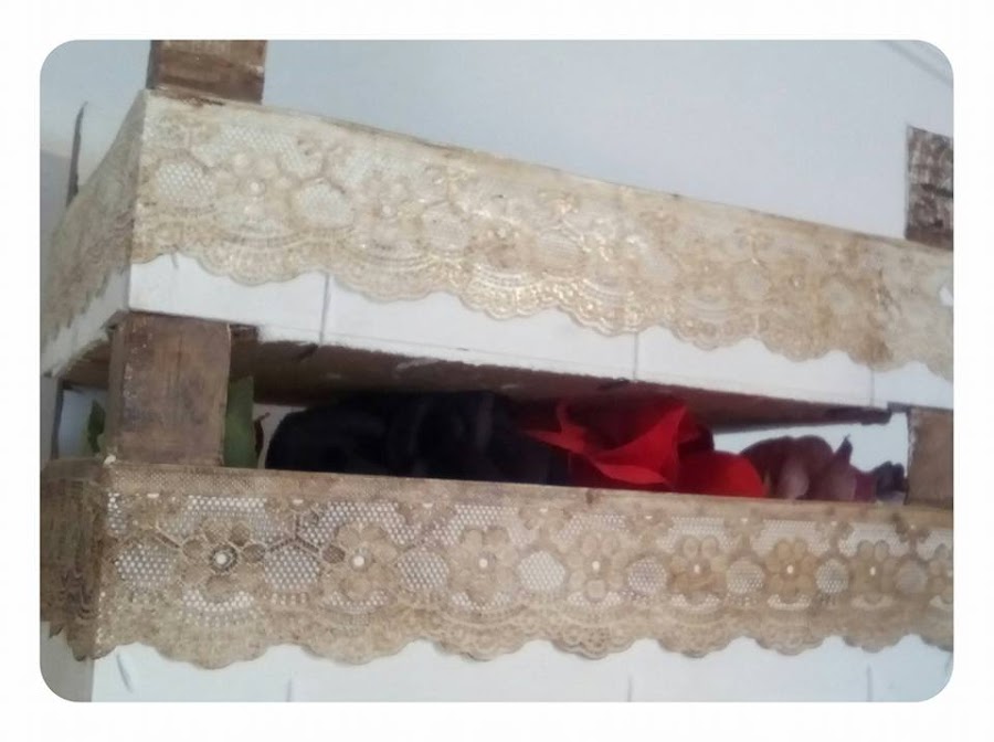 Caja decora con encaje de plástico y dado un aspecto vintage con un poco de betun de judea, utilizada para guardar complementos.