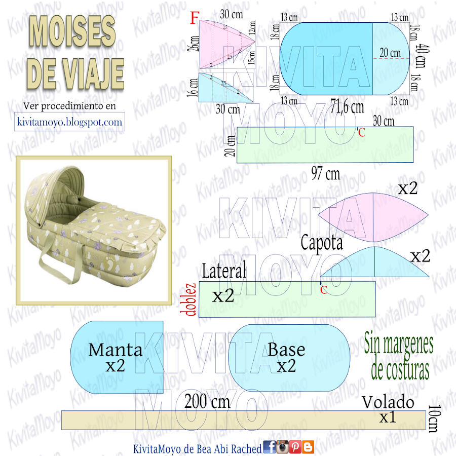 El covertor se puede sujetar al moisés con broches a presión o velcro, e incluso ganchitos.NOTA: para hacer la funda del colchón usar la base del moisés cortada por dos a la que se le incorporara un fuelle que mida de ancho la altura del colchón, y de largo la medida total del contorno del colchoncito, mas margenes de costura.