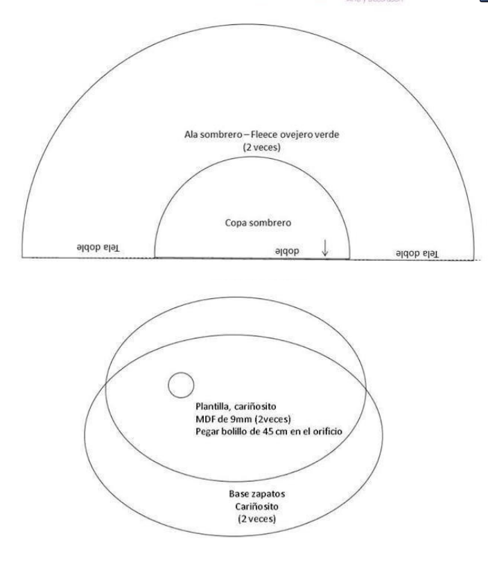 Coser a Maquina las partes del cuerpo, poner plantillas en los zapatos, abrir orificio en la parte del cuerpo para introducir el palo. Introducir el granito en una bolsa en la base del zapato que va en el piso para que se sostenga. rellenar con algodon siliconado, el resto del zapato, el cuerpo, la cabeza, y los brazos. Coser los zapatos al cuerpo. Cerrar el cuello y la cabeza con puntada envolvente (fruncido).
