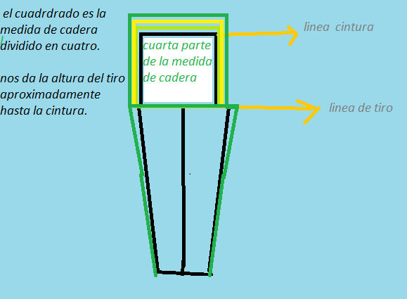 Los pantalones sin costura lateral o sea de dos piezas son los mas fáciles de trazar y confeccionar. Este es el trazo del delantero usando las medidas. El cuadrado que vemos inicialmente es la cuarta parte del contorno de cadera lo tendremos en cuenta para otras medidas de prendas más grandes ya que con esto obtendremos la altura del tiro en forma aproximada automáticamente.