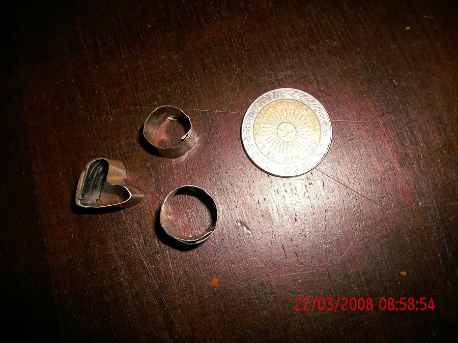 DE ESTA MANERA FORME UN CIRCULO, LUEGO CON UNA PINZA LO DOBLE DÁNDOLE FORMA DE CORAZÓN, EN ESTA ULTIMA FOTO PUSE UNA MONEDA DE 1 PESO ARGENTINO, PARA QUE SE PUEDA APRECIAR EL TAMAÑO, ESTO TAMBIÉN SE PUEDE HACER CON LAS LATAS DE REFRESCO O GASEOSAS.