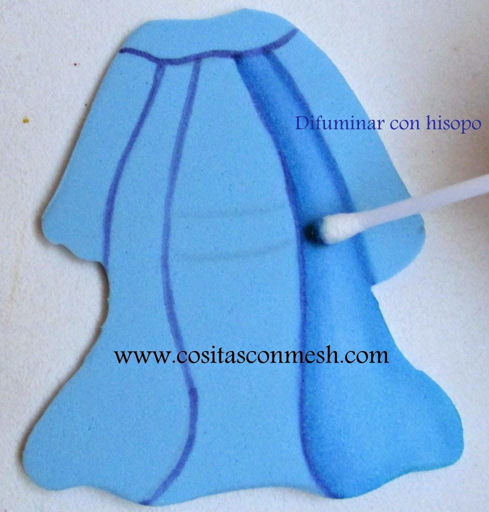 4.-Ahora hago lo mismo con los zapatos o sandalias, delineo con plumón marrón y difumino con el hisopo. Es así de simple como podemos darle mas realce a nuestras manualidades en goma eva. Ahora que ya aprendimos repetimos el procedimiento con la virgencita, usando plumones en otros colores.