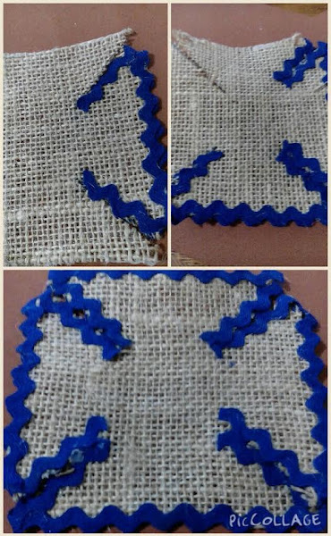 En cada orilla de los triángulos cortados pegué soutache color azul, de ambos lados.