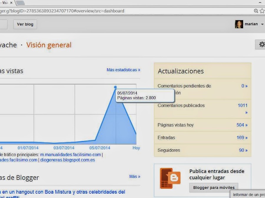 Como veis, en este gráfico, se ve el día a día del blog: ya son 90 seguidores, más de mil comentarios, y 170 entradas en año y medio... contando con el record de 2800 visitas en un día!!!, quién me lo iba a decir cuando lo abrí!!!