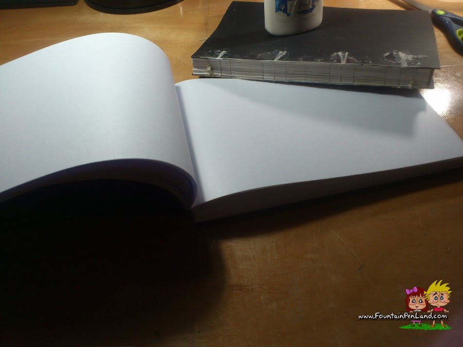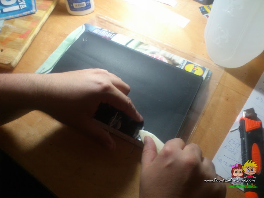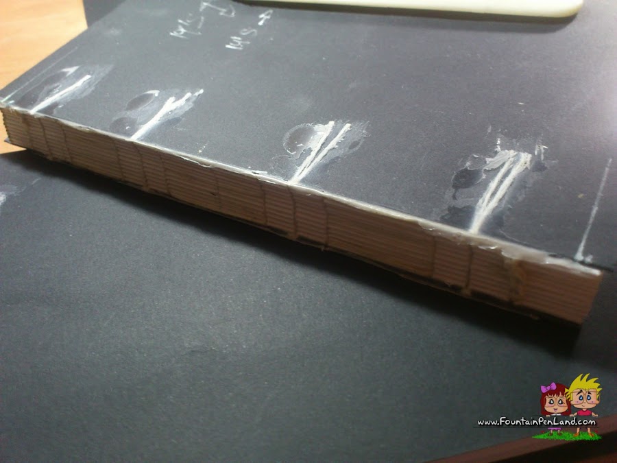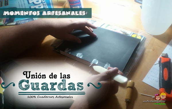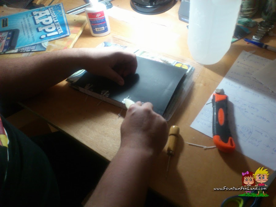 Toda libreta / cuaderno que se precie debe de llevar unas buenas guardas que sirvan como nexo de unión entre el cuerpo de la libreta y sus tapas. Hay muchos procesos y técnicas con este propósito. Este es la mía cuando las libretas están cosida al estilo medieval con telar. Los flecos que sobran del corte de la guías de cosido, se deshilachan y se pegan a la parte posterior de la guarda que está previamente pegada al lomo de la libreta.