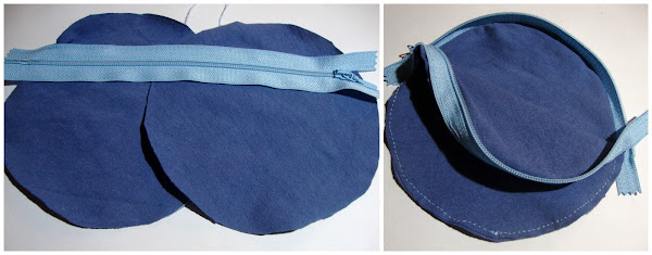 Por otro lado, con dos recortes de tela elástica (de una camiseta) cortados en circunferencia (un poco mayor que la cartera para poder hacer los dobladillos y un fondo holgado) y una cremallera de 10 cm, cosí el forro interior como veis.