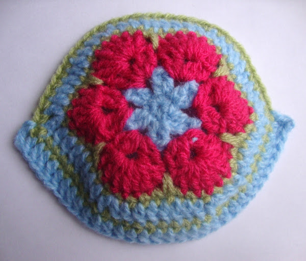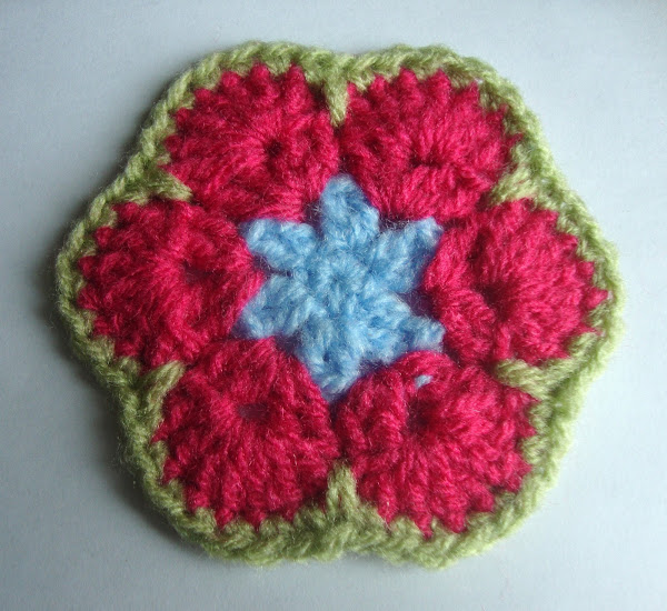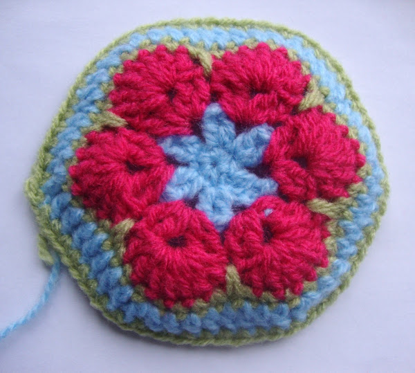Rodeamos la flor de una primera vuelta en azul, de puntos altos con un aumento en el pico de cada pétalo (2 puntos altos tejidos sobre el mismo punto y separados por una cadeneta).
