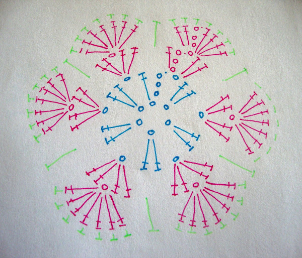 La parte central, como ya os he dicho, corresponde al núcleo de la flor que había tejido para la muestra del buho (deshice el resto para darle otra forma en este caso).