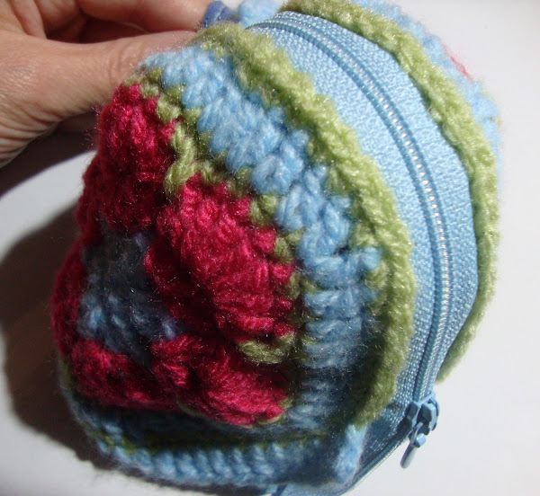 En la mitad inferior, juntamos las dos piezas de crochet para unirlas con el propio ganchillo y cerrar el monedero. Es una vuelta de ondas sencillas repitiendo la secuencia "1 p bajo, 2 p altos en el mismo punto, 2 puntos altos en el mismo punto, 1 p bajo". (8 ondas, 32 p de base).