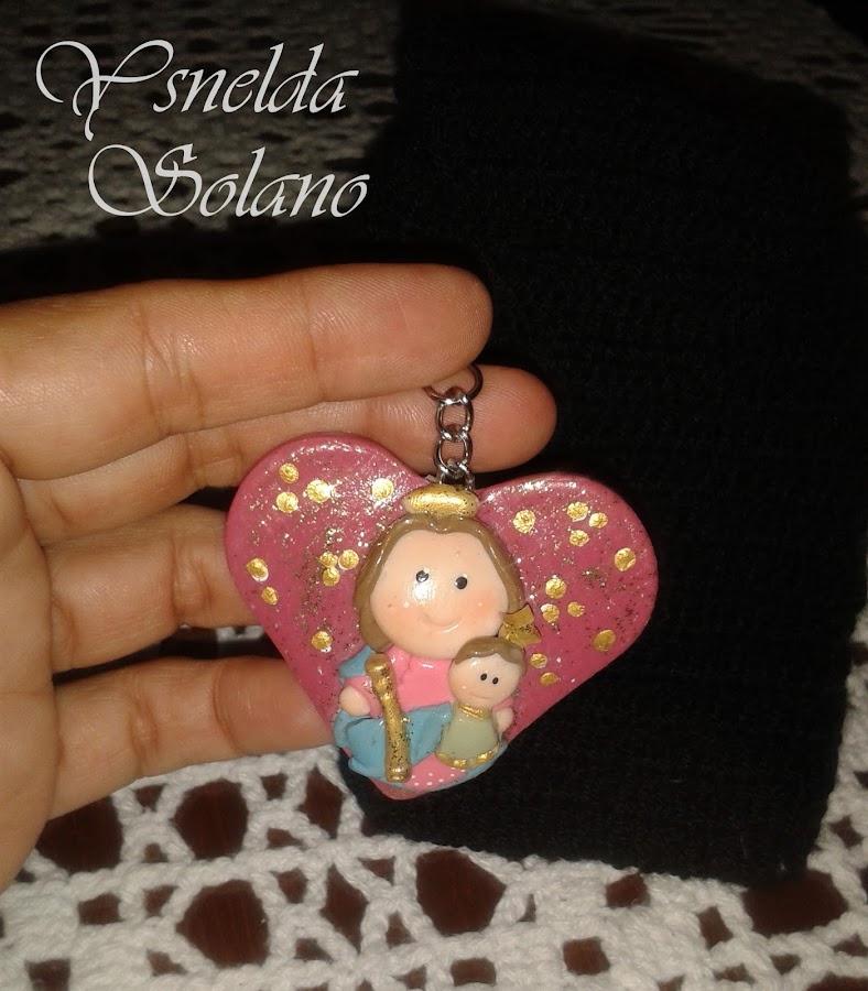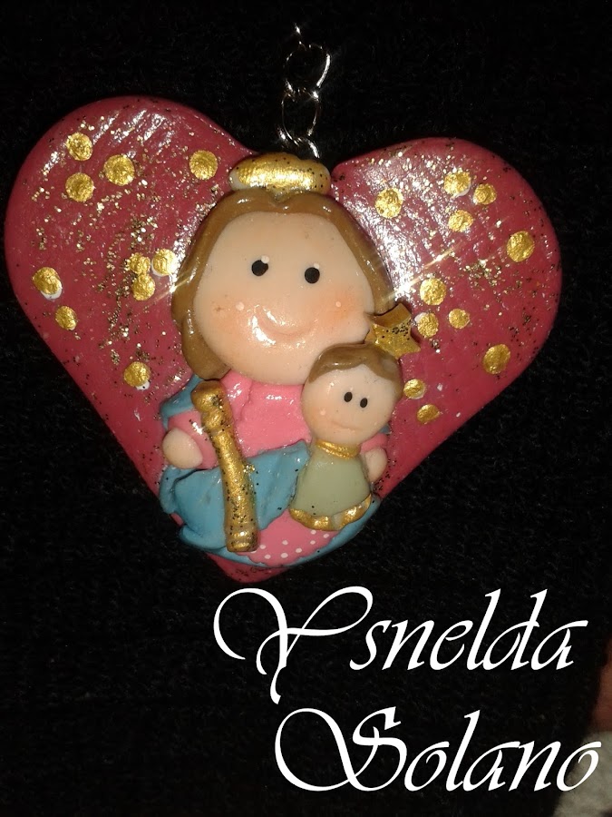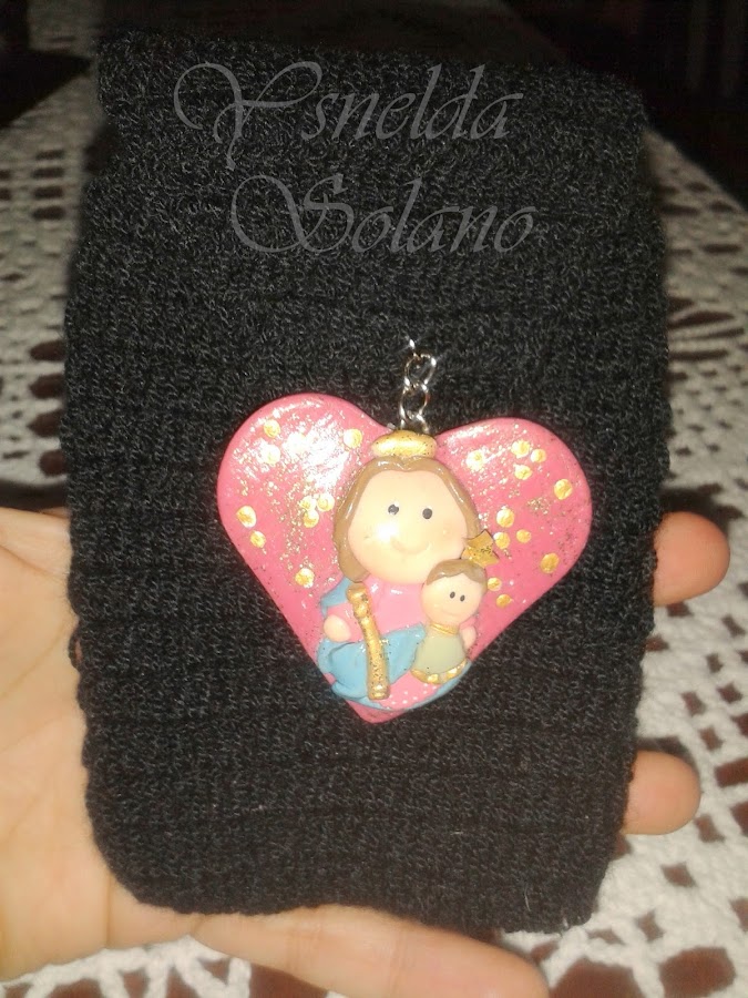Para decorar mi monedero utilicé una aplicación de forma de Corazón con la Virgencita Maria Auxiliadora. En su realización, utilicé los siguientes materiales: Masa Flexible o Porcelana Fría. Pinturas al agua. Pega o cola blanca. Rodillo. Cortadores. Estecas o estiletes. Pedacito de cadena.