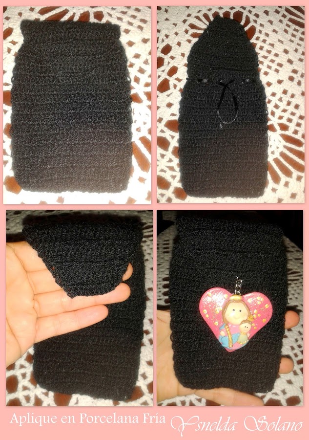5) Para terminar la piecita en masa Flexible, realicé ojitos, maquillaje y coloqué unos punticos dorados en el corazón. Luego fije la piecita con hilo a la solapita tejida del monedero.