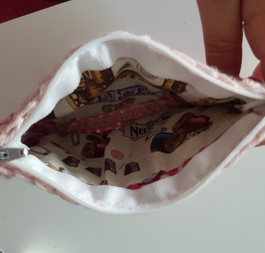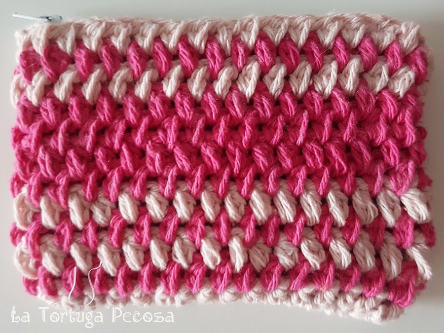 Hecho con hilo de algodón para evitar que se hagan bolitas, en tonos rosa palo y pink, es supersuperfuncional, pues caben tarjetas y efectivo y lo mejor es que como veis en la foto, va superbien forradito por dentro, por o que no perdemos nada, mérito de mi Madre :) .