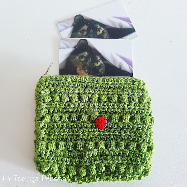 ¿Habéis visto que cosita más mona? pues sí, es lo que me evoca este monedero, parece un parque con una mariquita que camina por el césped. Está hecho con hilo de algodón de caricia. Va a punto enano y punto piña, que lo hace más dinámico.