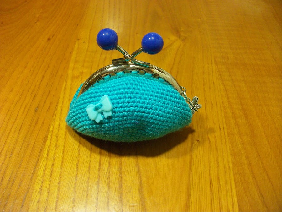 Monedero de ganchillo azul turquesa con boquilla de bolas azulón, botón grande de lazo azul y charm mariposa