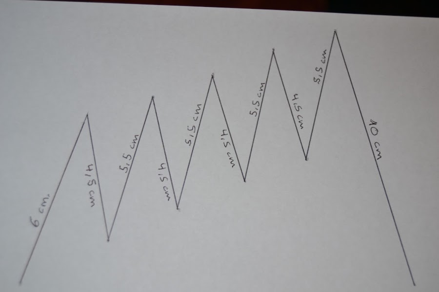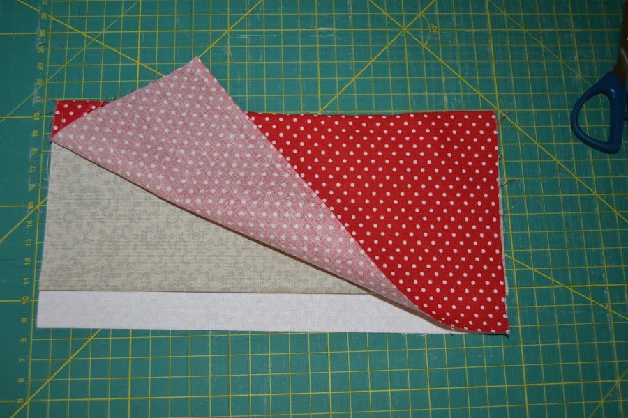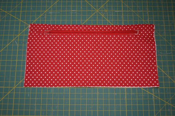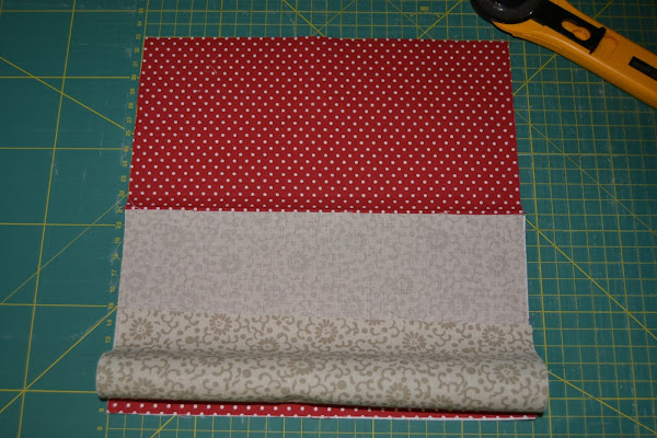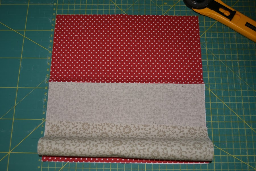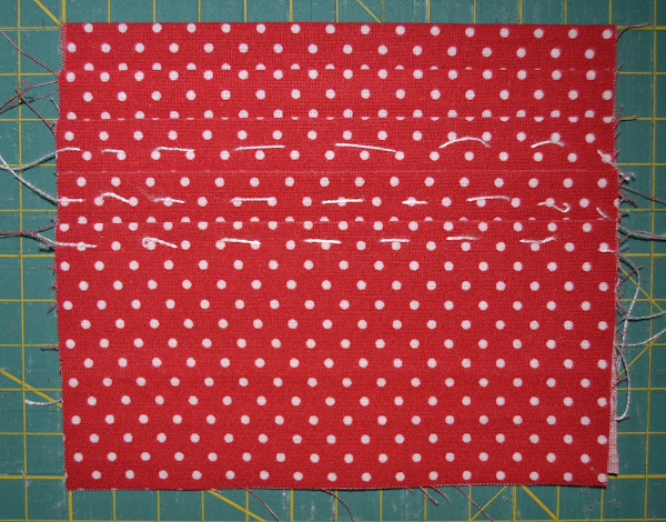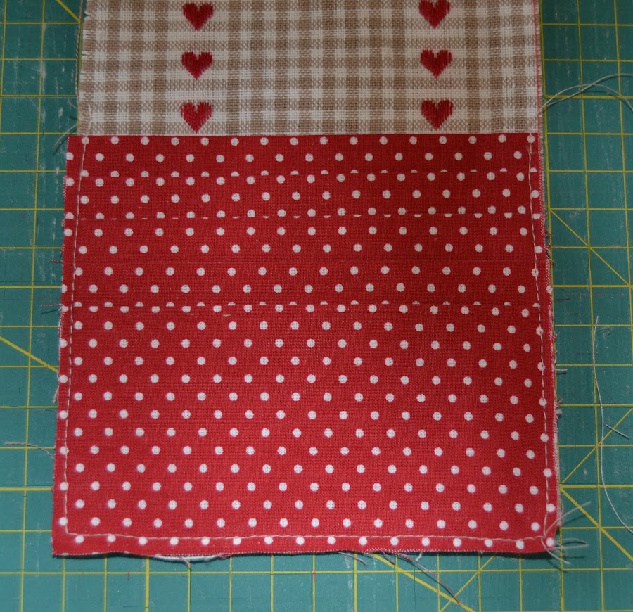 Para el compartimento donde van las tarjetas, cortar una tira de tela (en mi caso es la roja con lunares blancos) de 12cm x 56cm , doblar en abanico según muestra la figura y alisar con la plancha: