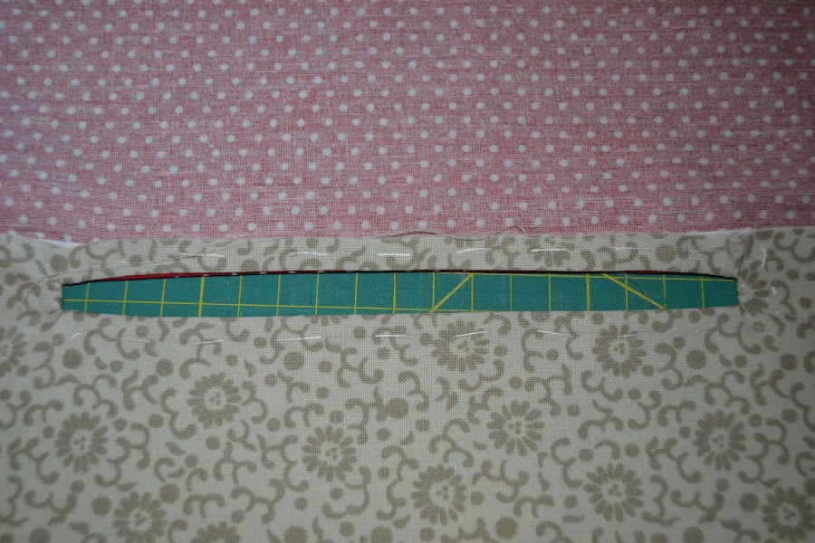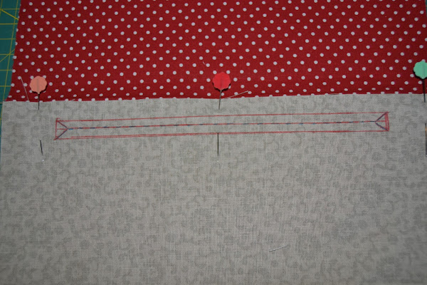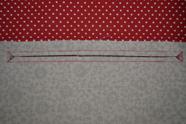 Dibujar un rectángulo de 18cm x 1cm a 1,5cm del borde y fijar las dos telas con un pespunte por las líneas de ese rectángulo: