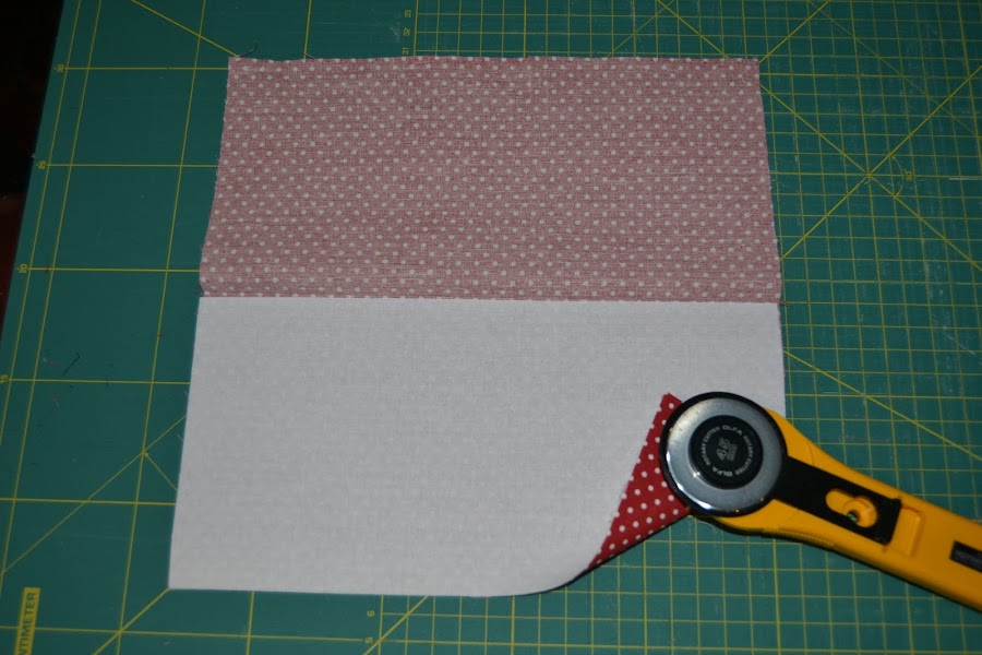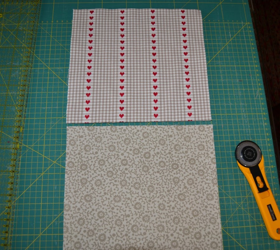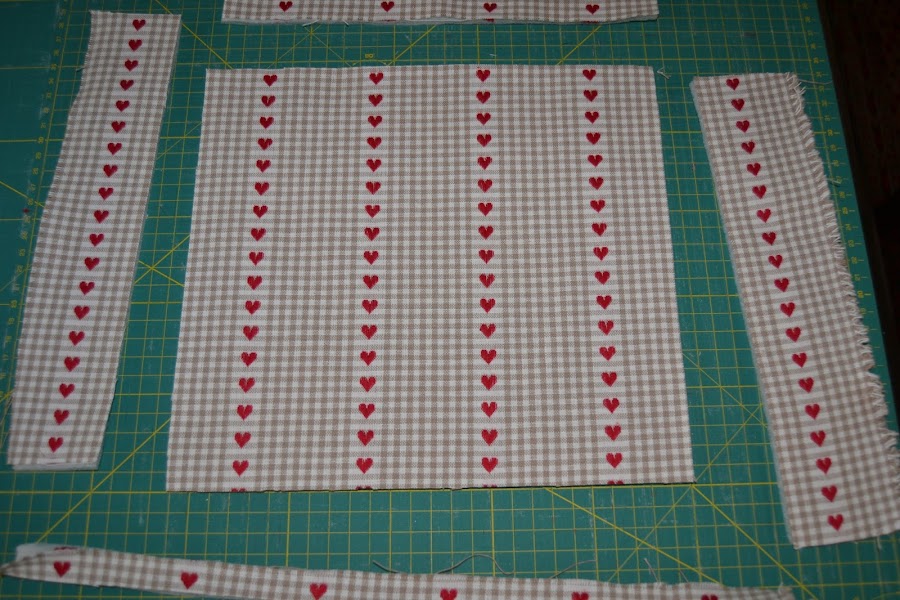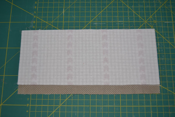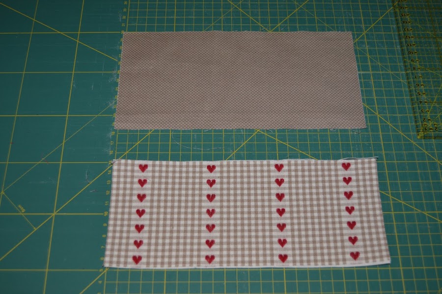 Cortar una pieza (tela de corazones) de 24cm de ancho por 9cm de alto y plancharle por el revés una pieza de fliselina de igual tamaño.