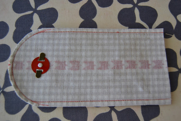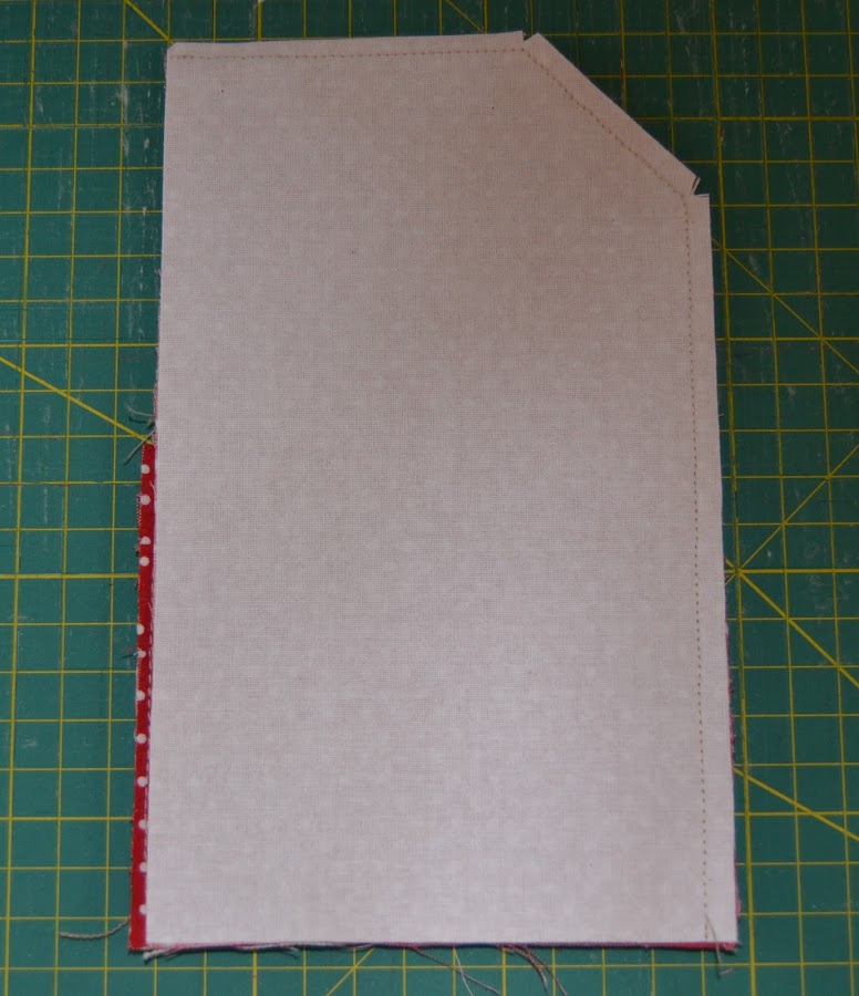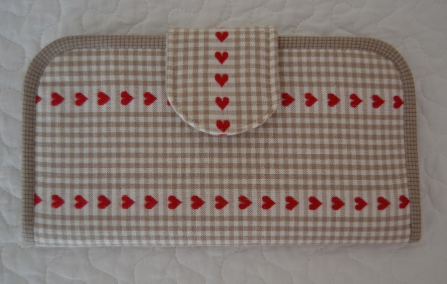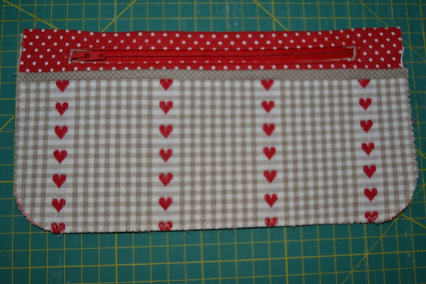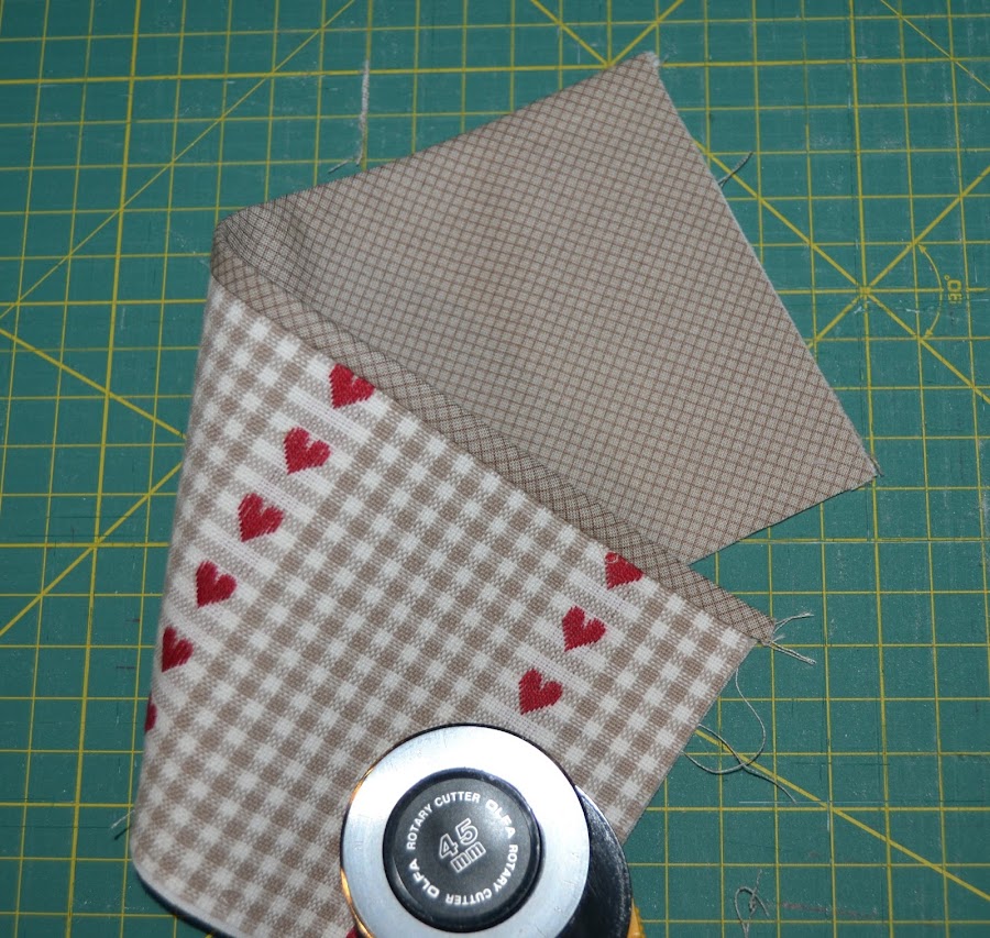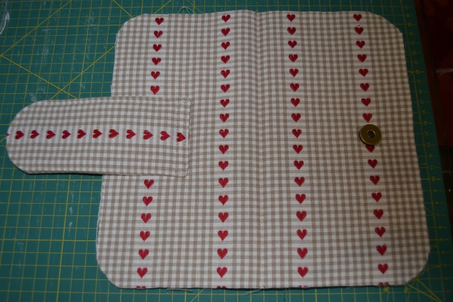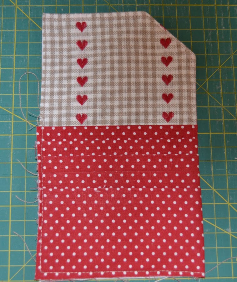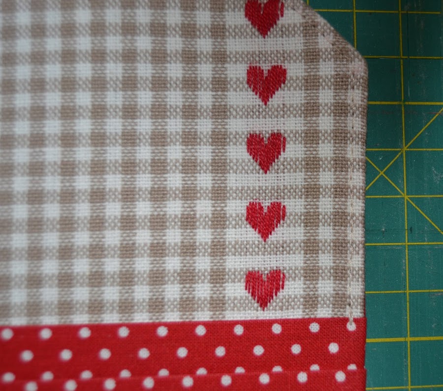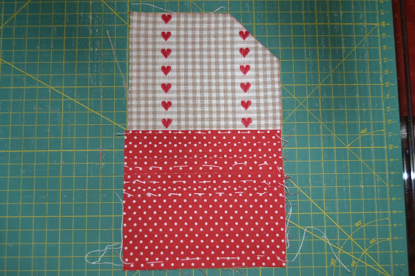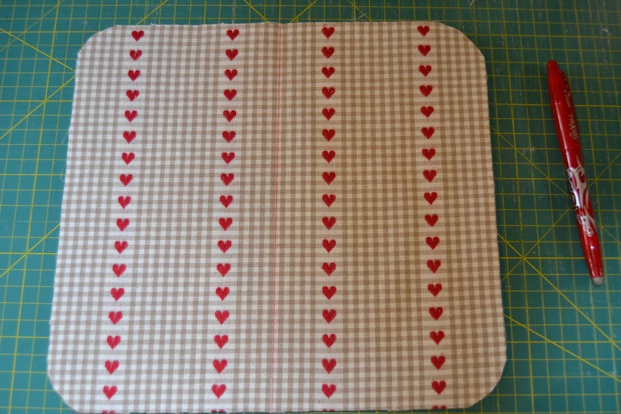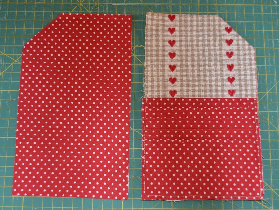 Cortar un rectángulo de tela (la de corazones) de 12cm de ancho x 20cm de alto, hacerle un corte en la esquina superior derecha para que quede con esta forma. Colocar el abanico como se ve en la foto de modo que los cantos inferiores casen perfectamente. Pespuntear los cantos laterales e inferiores para que la pieza no se deslice: