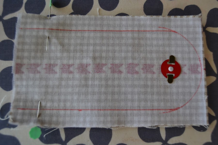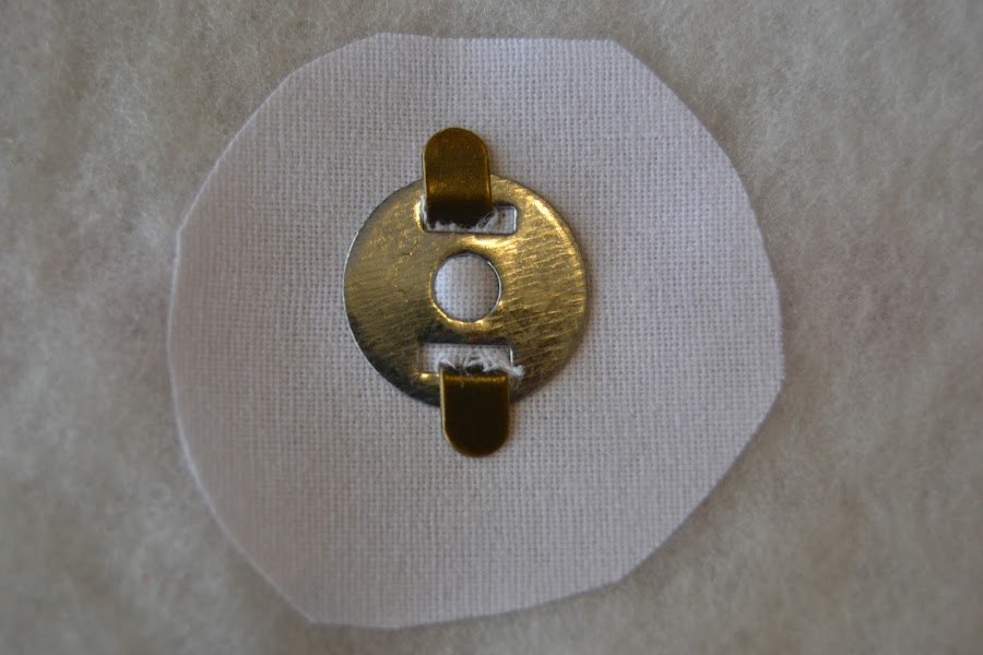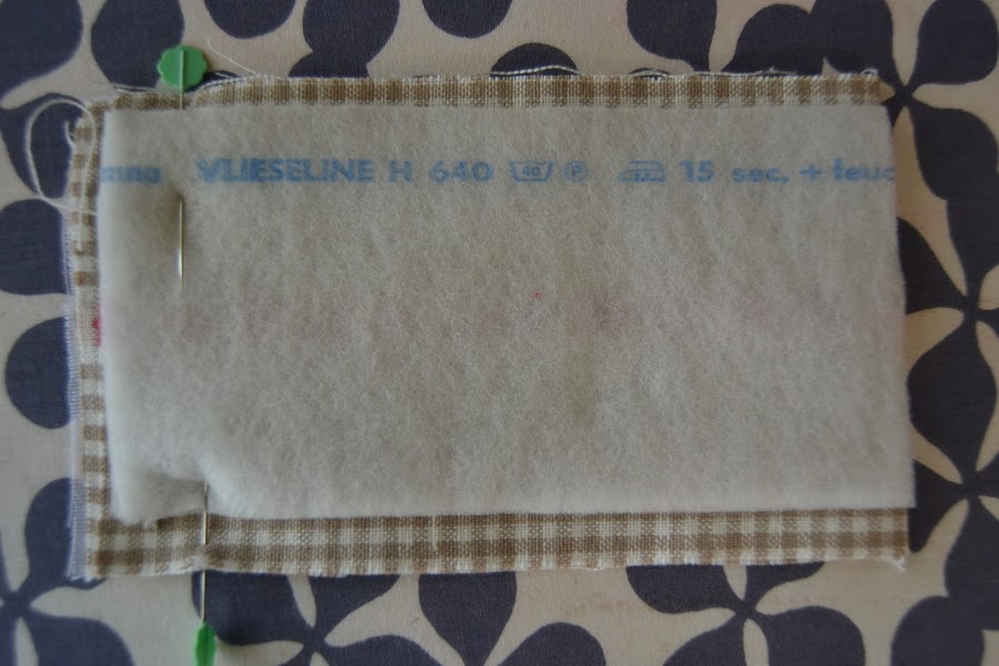 Hacer la lengüeta de cierre. Por el lado que se pone el broche reforzar toda la tela con fliselina y por el lado que queda hacia arriba fijarle guata para que quede más acolchada: