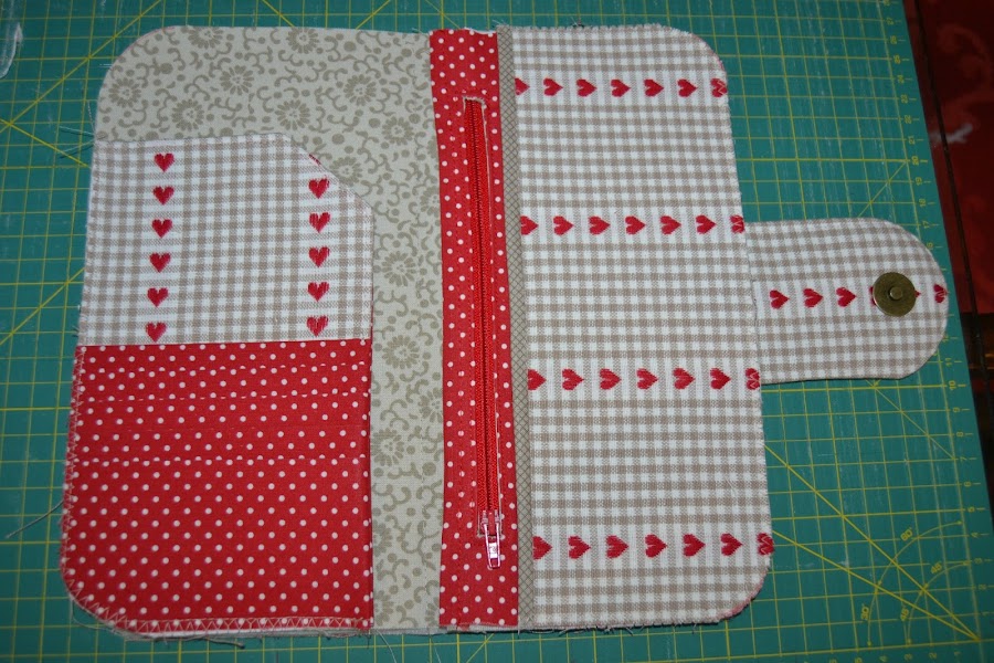 Coser las dos tapas, derecho con derecho, por la línea marcada, dar la vuelta a la pieza, planchar y coserla a la cartera por la parte de atrás: