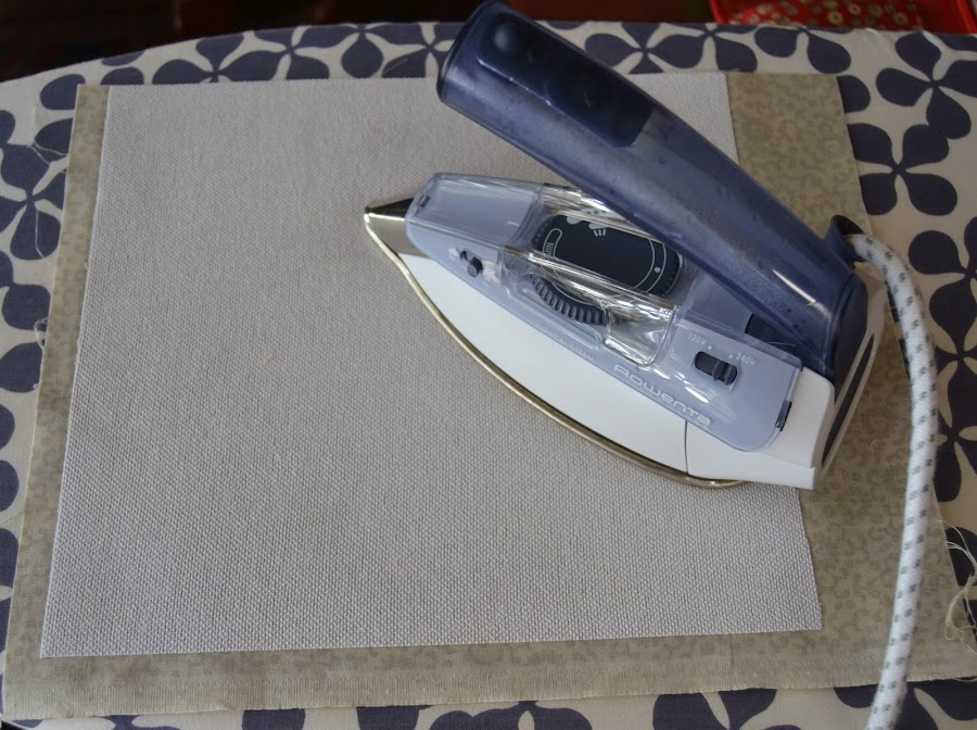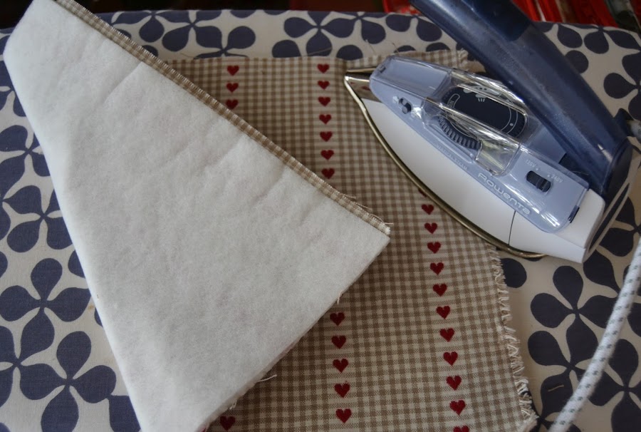 Comenzar cortando la tela exterior dándole un poco más de margen y la guata termoadhesiva. Nos tiene que quedar una vez preparada definitivamente de 26cm. de ancho por 24cm. de alto. Fijar con la plancha ambas telas: