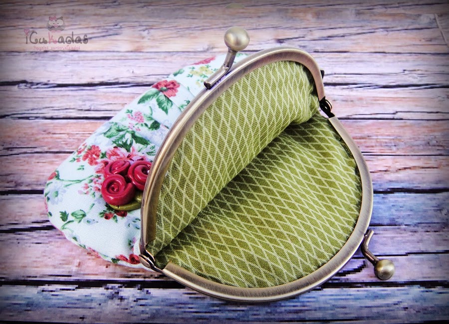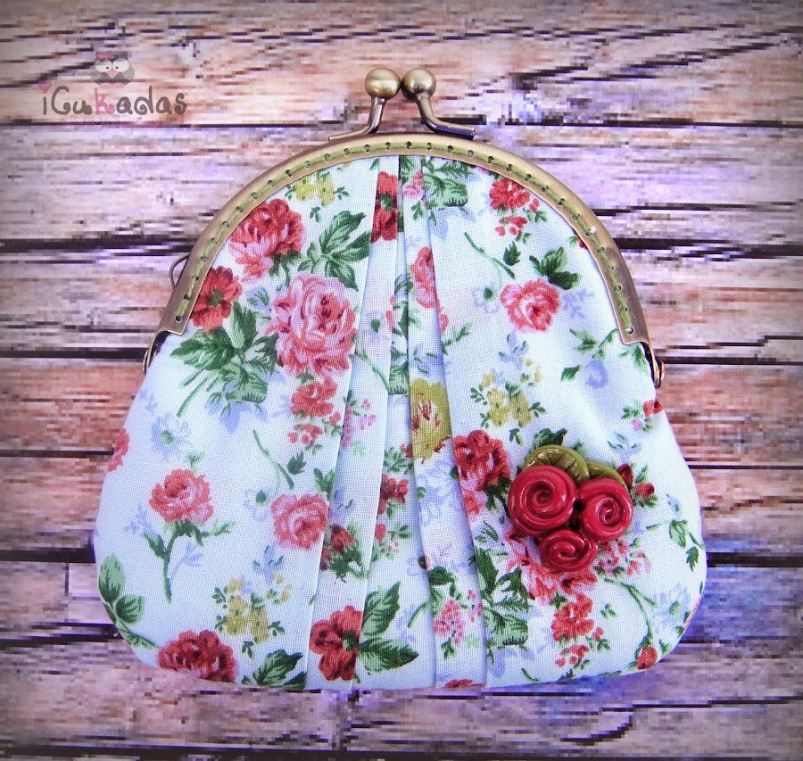 Eso si, van bien rematados y forrados por dentro, que a mi eso de que se vean los costurones no me gusta nada de nada, y en este le puse un aplique de rosas de fimo, a juego con la tela, todo conjuntadito, como no.