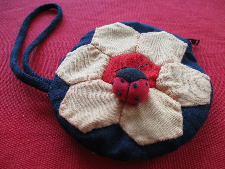 ESTA FOTO MUESTRA EL FRENTE, DONDE SE VE UNA FLOR CENTRAL DE EXAGONOS TODA COCIDA A MANO, ESTA FLOR DESPUÉS DE ARMARLA LA COLOQUE SOBRE UN CIRCULO DEL MISMO MATERIAL, O SEA LA MISMA TELA Y SOBRE EL CENTRO DE LA FLOR COLOQUE UNA MARIQUITA HECHA CON EL MISMO MATERIAL, LAS MOTITAS LAS BORDE CON HILO DE COSER EN NEGRO, UTILIZANDO PARA ELLOS EL PUNTO CON EL QUE SE HACEN LAS ROSAS ROCOCO.
