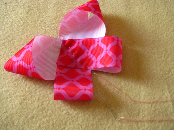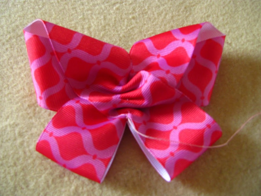 5.- Con el tramo de listón mas corto, haremos el cuerpo central de la mariposa rodeando el área fruncida y haciendo un nudo en la parte alta. Los extremos de este listón los cortaremos en diagonales o como mejor luzcan. Sellar estos exremos con calor (de encendedor o llama de vela), para evitar futuro deshilachado.
