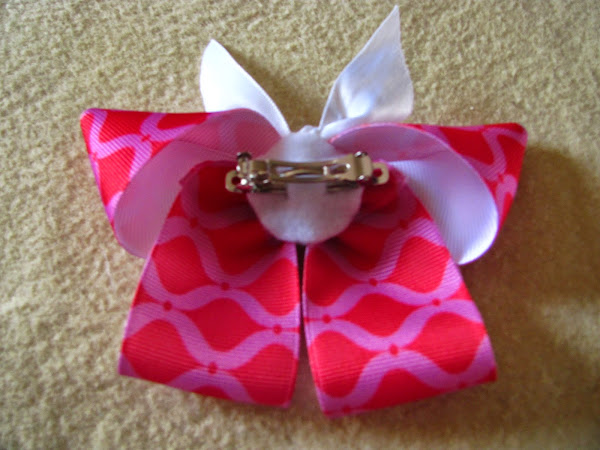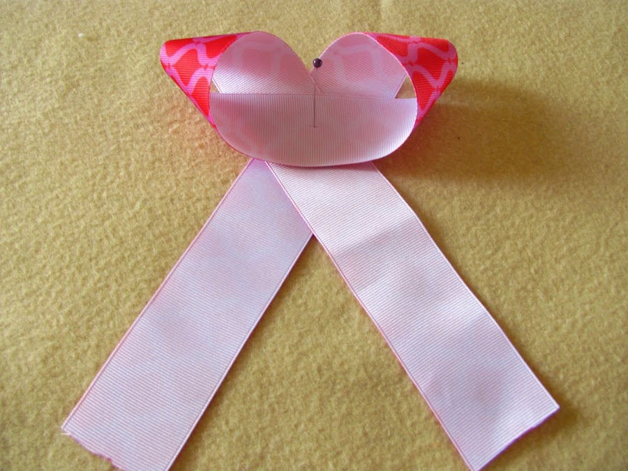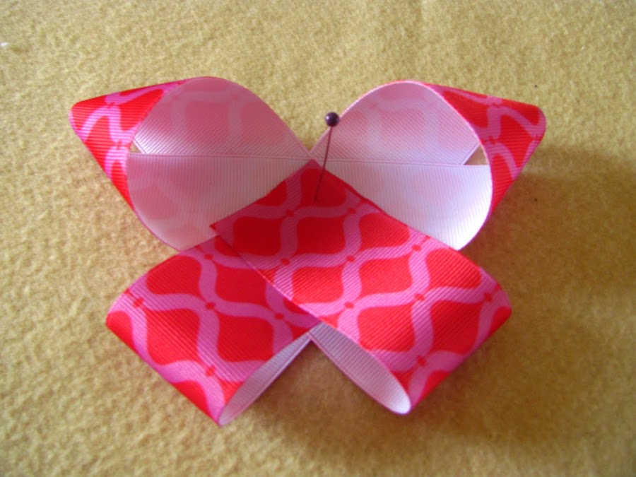 3.- Tomaremos uno a uno los extremos del listón y los colocaremos sobre la parte del bucle que acabamos de mover al centro. Volver a sostener con un alfiler. En este momento la forma de mariposa esta casi lograda. Observe la imagen de la derecha.