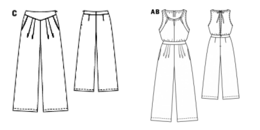 El modelo lo he hecho tomando dos diseños de Burda y transformándolos a mi gusto. Por un lado los pantalones, con una cintura en pico, que me pareció más interesante que el propio pantalón del mono y el cuerpo del mono tal y como venía en el patrón. Pero combinando con piezas de tejido en crep negro, por ejemplo la espalda que esta dividida en dos tejidos (negro y estampado).
